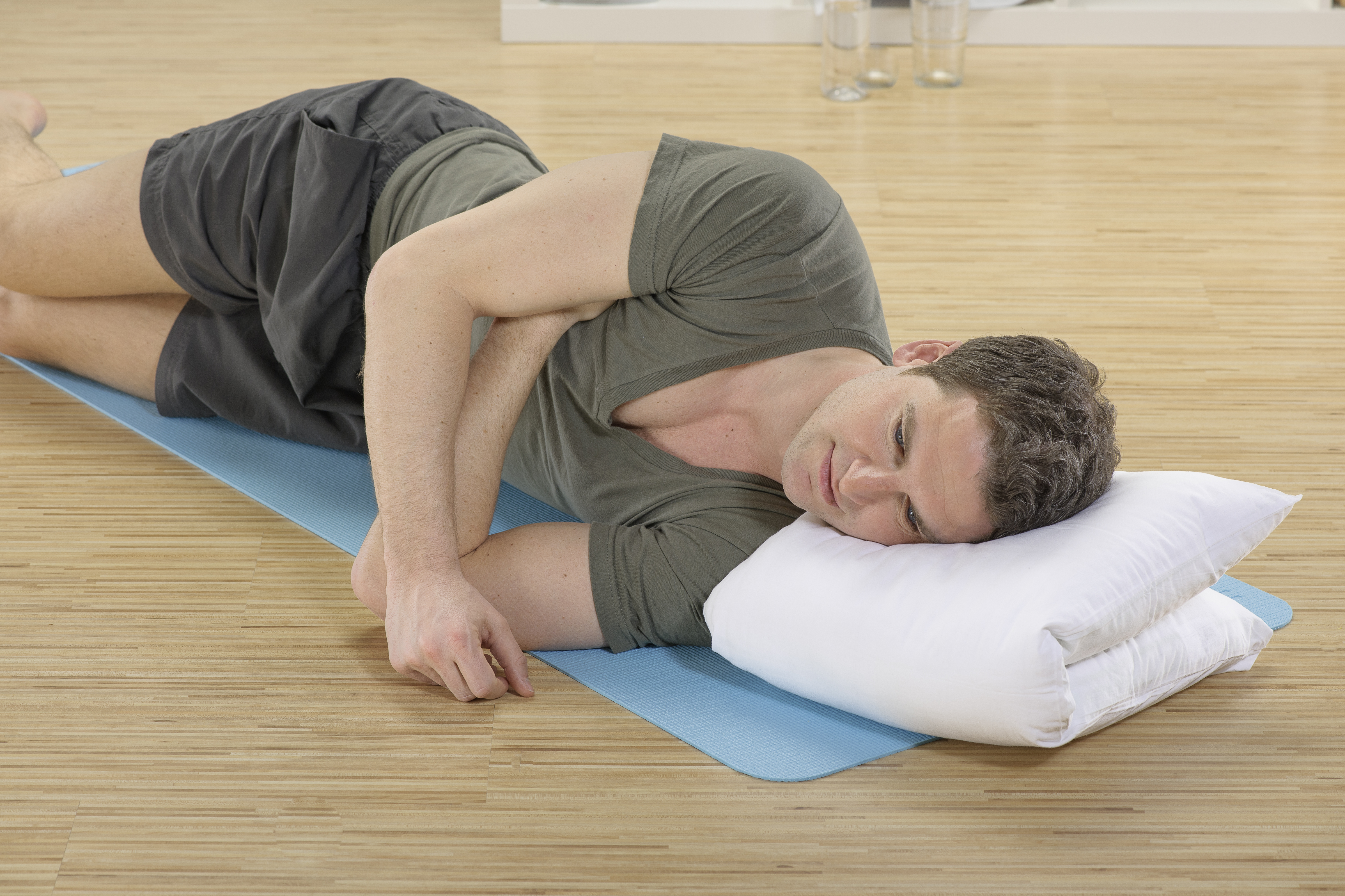1. Legen Sie sich auf die Seite auf Ihre Unterlage, ganz so, als würden Sie sich zum Schlaf betten oder zum Ausruhen hinlegen. Ihr Kopf legt sich auf dem Kissen ab. Hat Ihr Kissen die richtige Dicke, sollte Ihr Kopf, wenn Sie sich entspannen, durch die Wirkung der Schwerkraft vom Rumpf weg in Richtung Kopfende gleiten können.